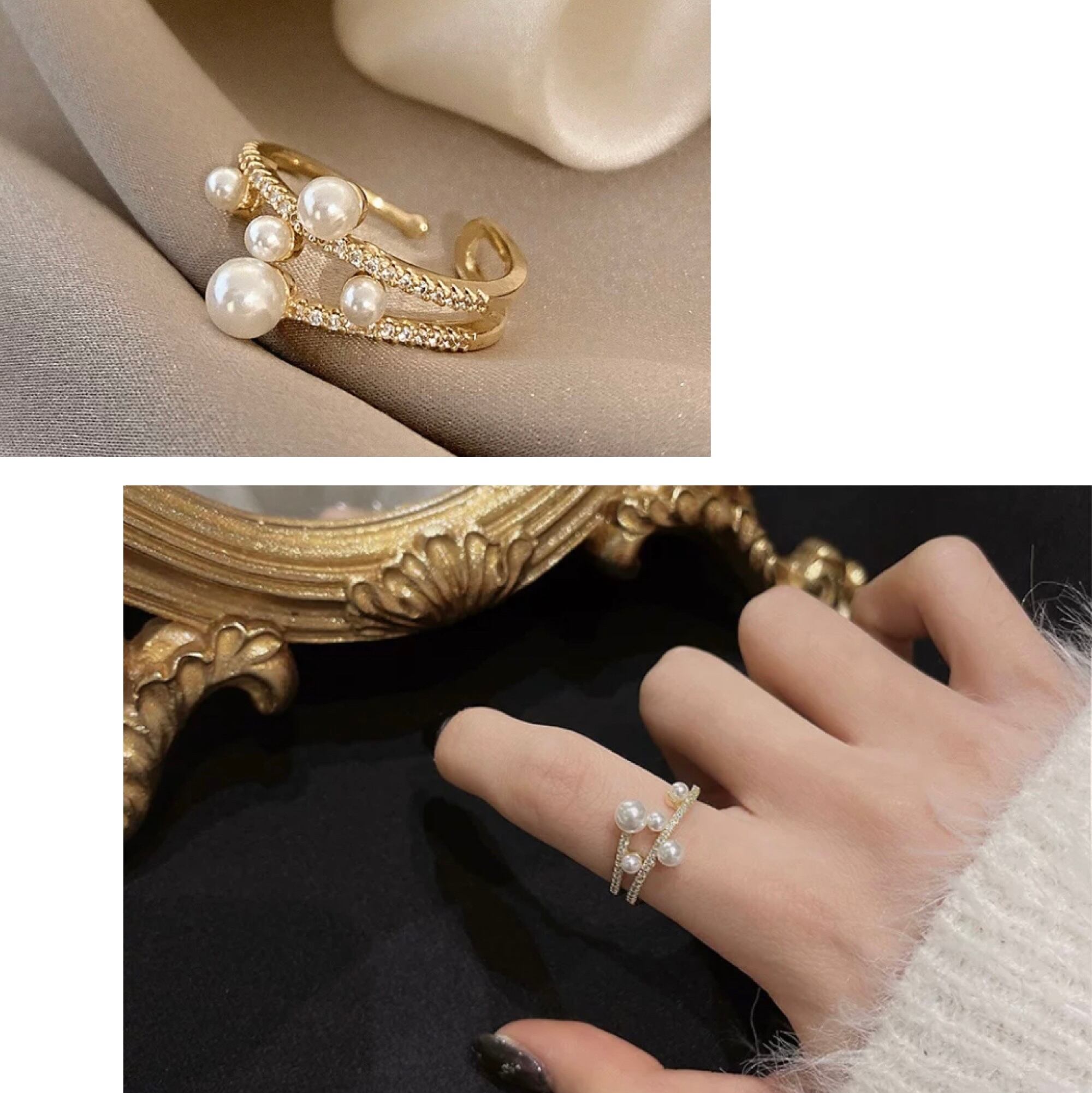 大粒パール2重重ねつけリング 指輪 レディース ゴールド サイズ調節 ジルコン